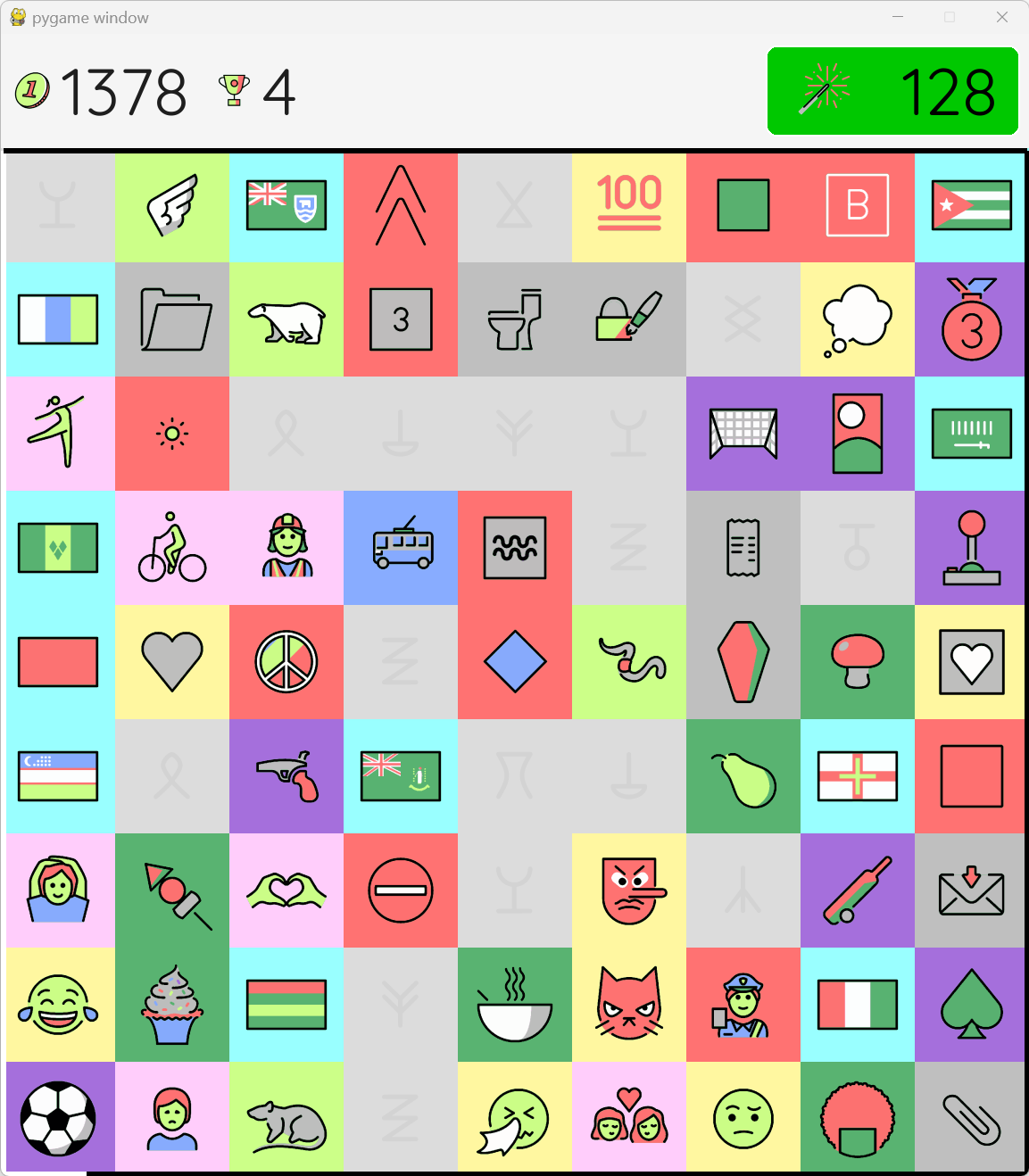 | Tags | 2D, Arcade, easy, emoji, Endless, High Score, pygame, Sprites, swipe, Tileset |